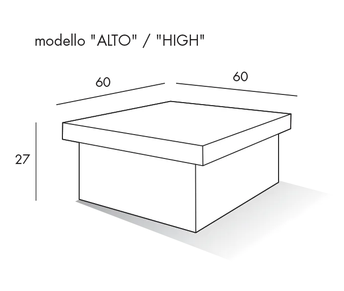 Il tavolino contenitore Asia è disponibile in versione alta H.27 e bassa H.24 cm, con dimensioni di 60×60 cm, per adattarsi perfettamente alle diverse esigenze di spazio e alle altezze delle sedute del tuo living. È possibile scegliere tra diverse finiture per il basamento e il piano (come la finitura scura effetto legno visibile in foto), per una personalizzazione che si integri al meglio con il tuo arredamento.