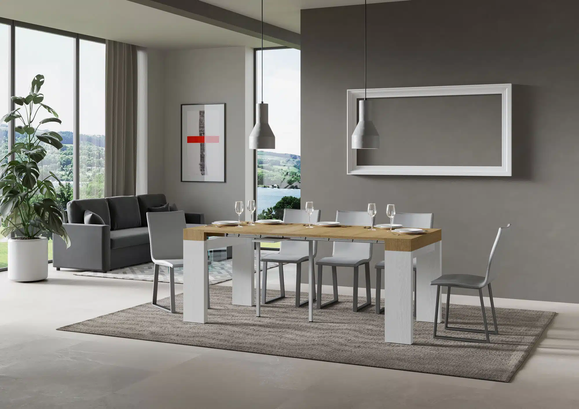 La consolle allungabile Roxell Mix Small può essere facilmente trasformata in un ampio tavolo da pranzo lungo fino a 196 cm, in grado di ospitare 10 persone.