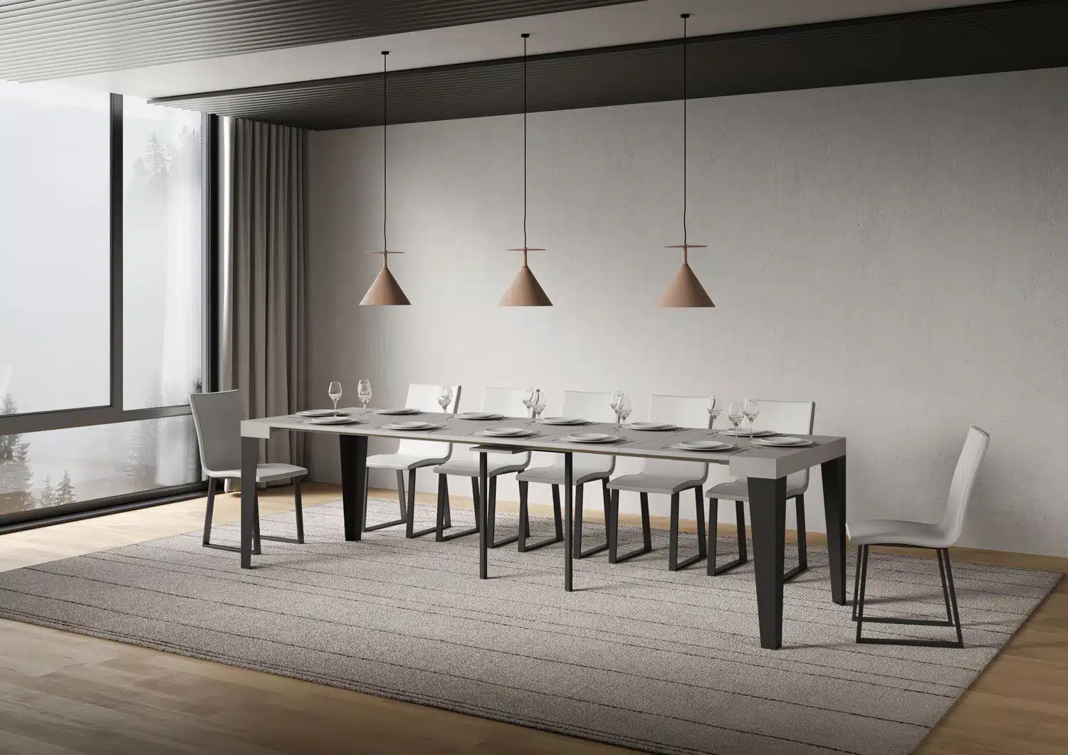 La consolle allungabile Flame può essere facilmente trasformata in un ampio tavolo da pranzo lungo fino a 300 cm, in grado di ospitare 14 persone.