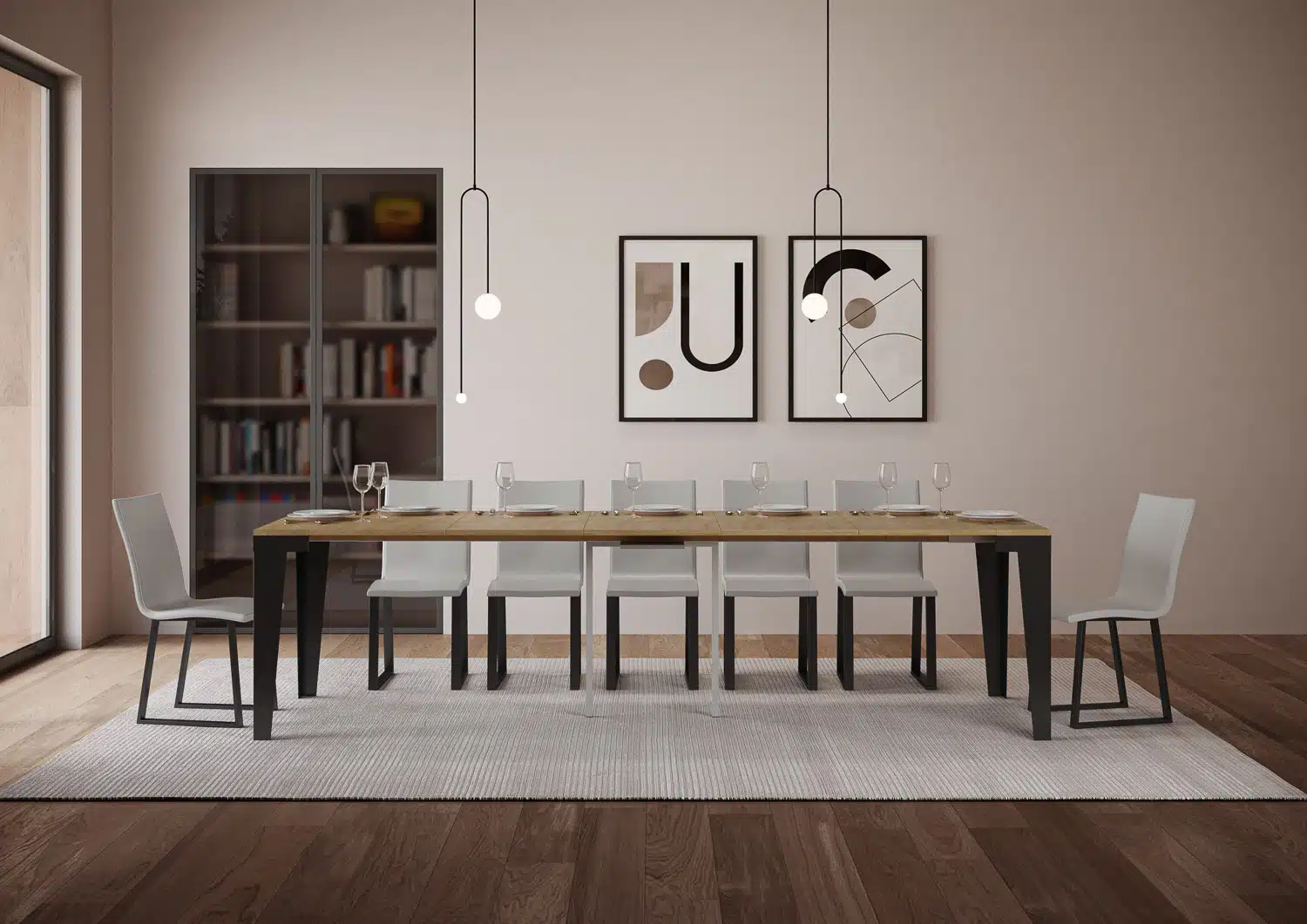 La consolle allungabile Flame Evolution può essere facilmente trasformata in un ampio tavolo da pranzo lungo fino a 300 cm, in grado di ospitare 14 persone.