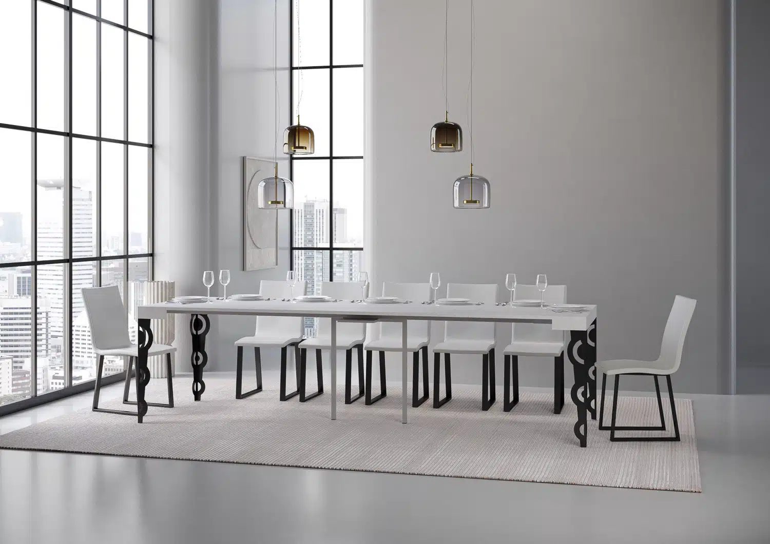 La consolle allungabile Karamay può essere facilmente trasformata in un ampio tavolo da pranzo lungo fino a 300 cm, in grado di ospitare 14 persone.