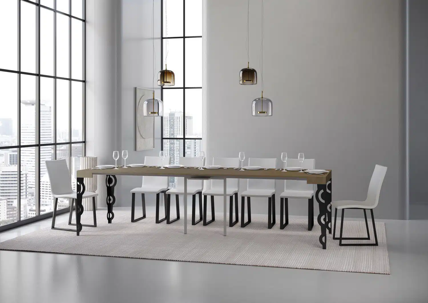 La consolle allungabile Karamay può essere facilmente trasformata in un ampio tavolo da pranzo lungo fino a 300 cm, in grado di ospitare 14 persone.