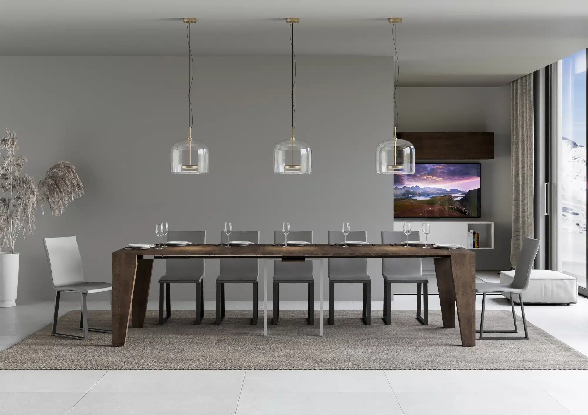 La consolle allungabile Naxy può essere facilmente trasformata in un ampio tavolo da pranzo lungo fino a 300 cm, in grado di ospitare 14 persone.