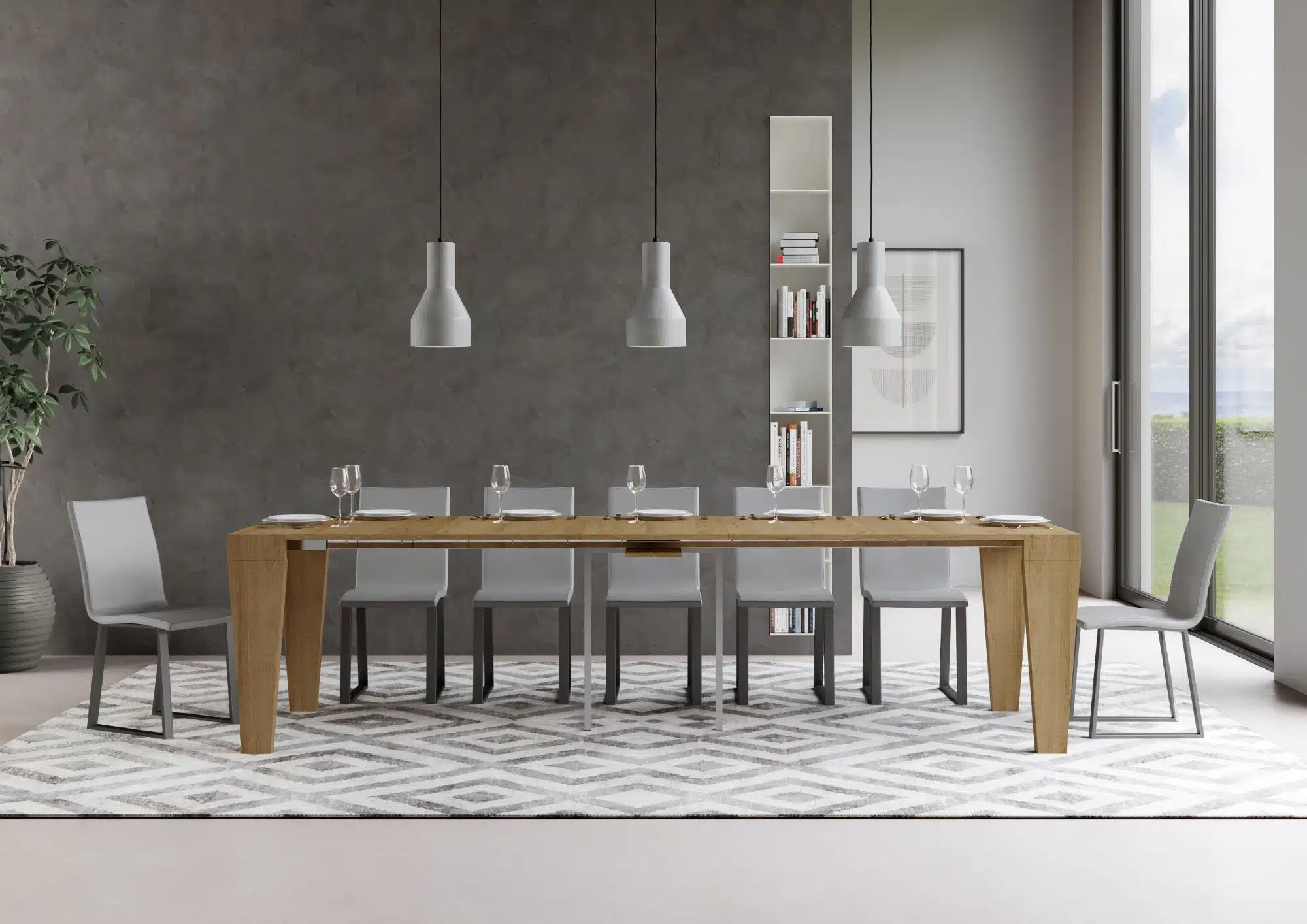 La consolle allungabile Spimbo può essere facilmente trasformata in un ampio tavolo da pranzo lungo fino a 300 cm, in grado di ospitare 14 persone.