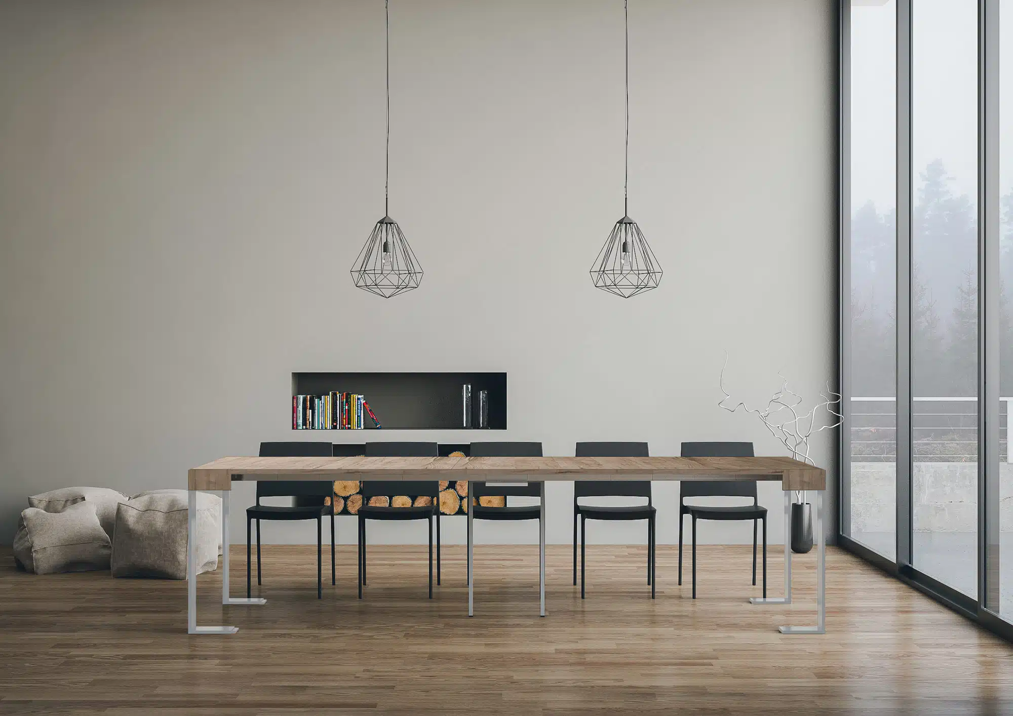 La consolle allungabile Tecno può essere facilmente trasformata in un ampio tavolo da pranzo lungo fino a 300 cm, in grado di ospitare 14 persone.