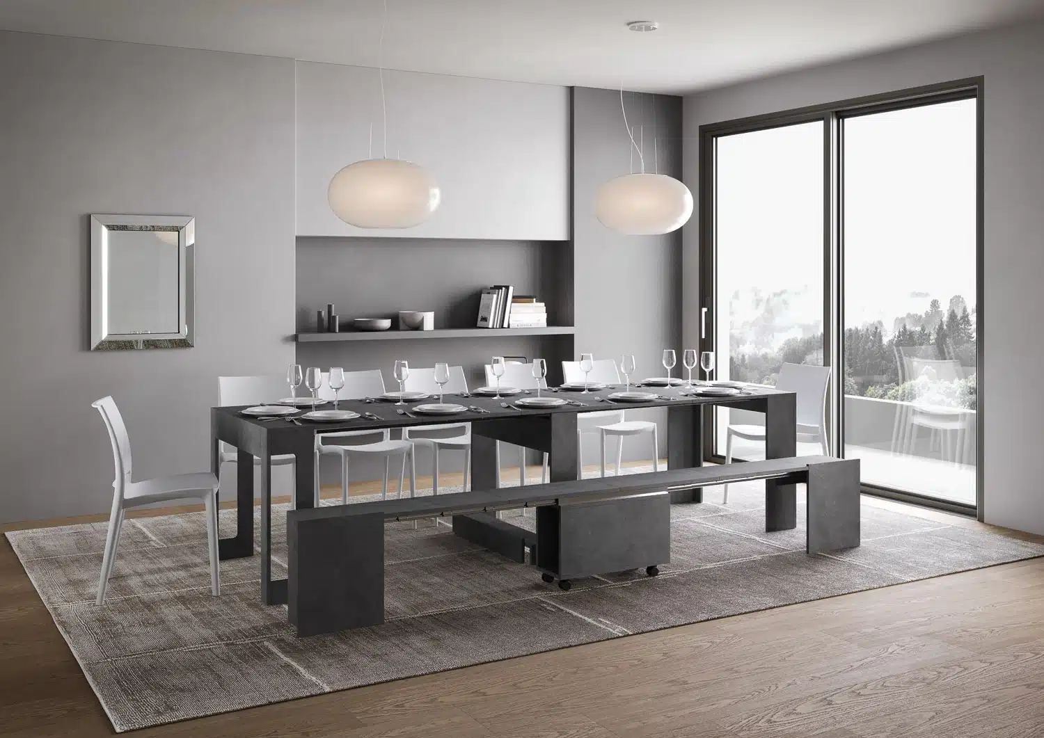 Al suo interno, quando chiusa, la consolle contiene una panca allungabile progressivamente fino a 300 cm in grado di ospitare fino a 6 persone.
