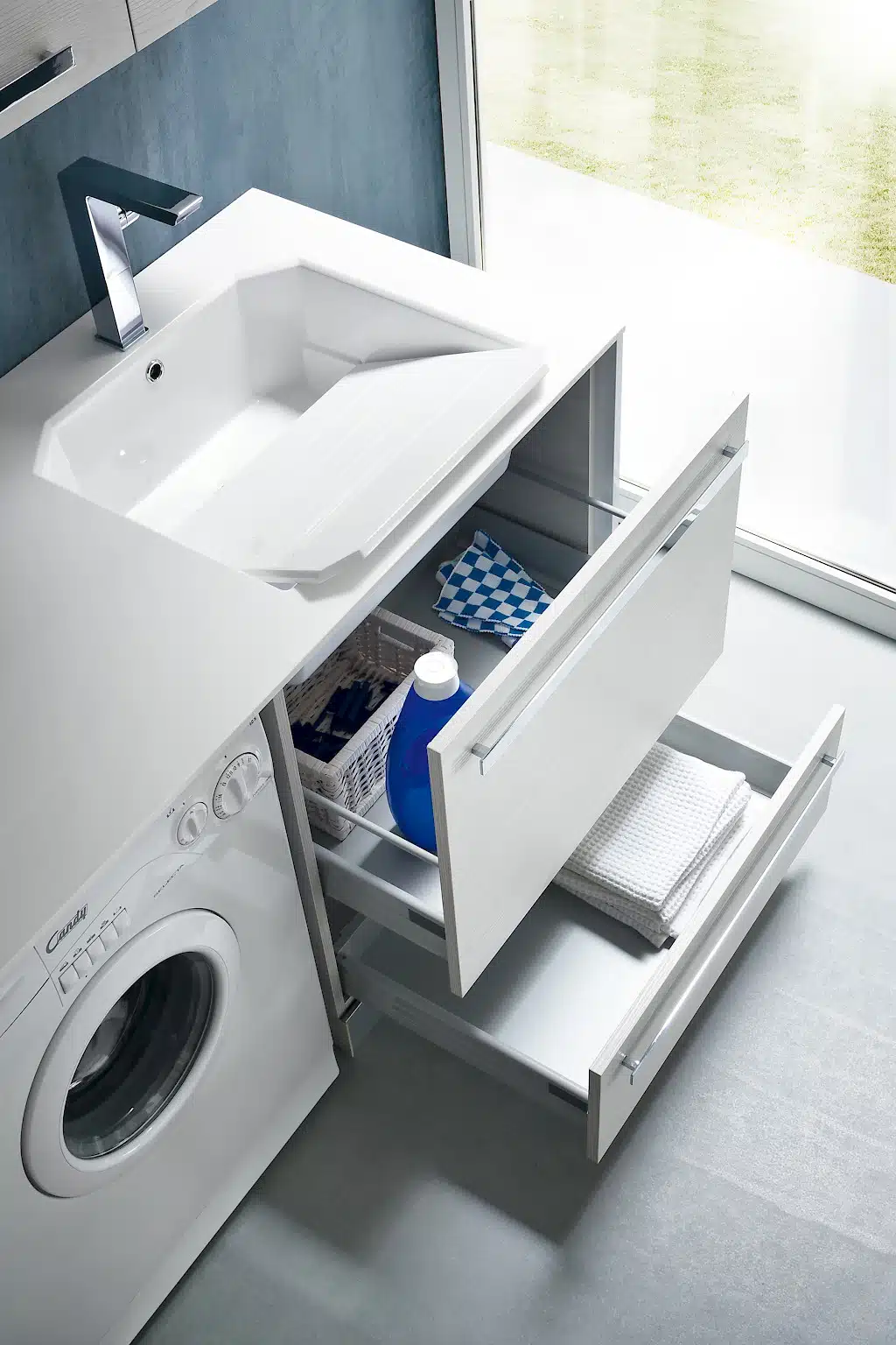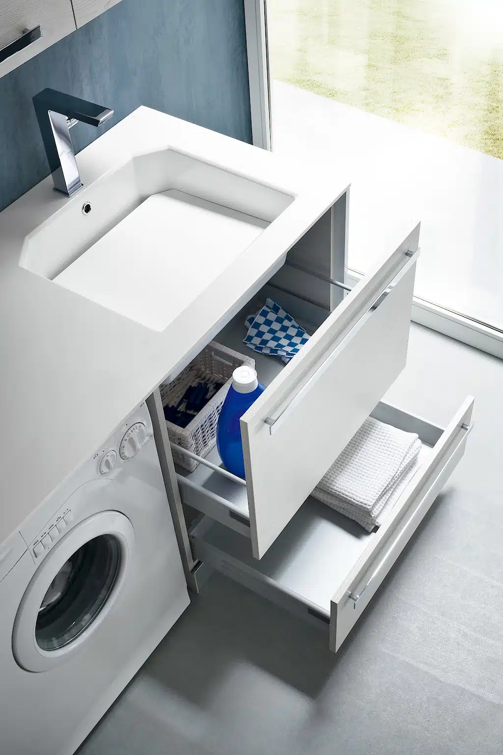 - Lavatoio Integrato: Include un moderno lavatoio incasso soprapiano con vasca MISTY in Mineralmarmo, per un design pulito e funzionale.
