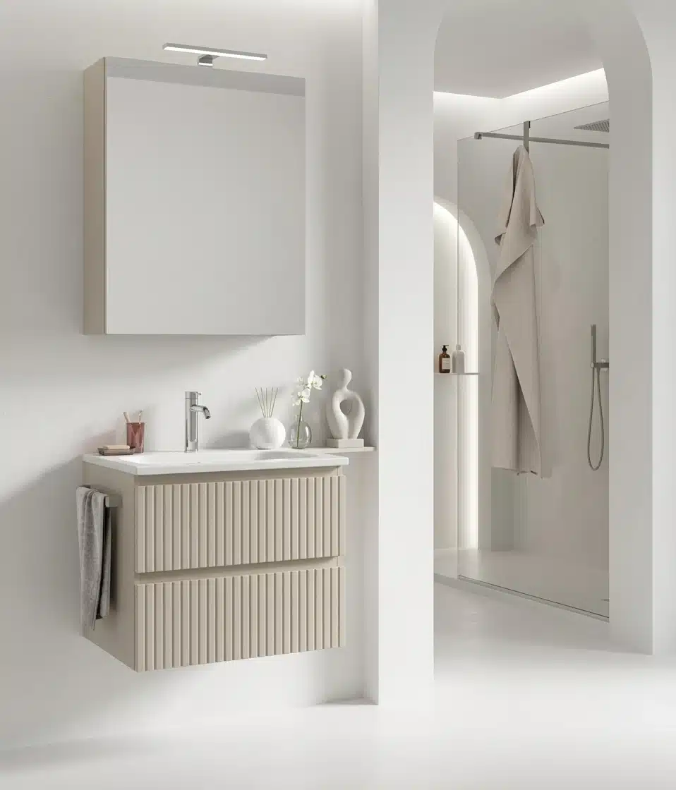 Il mobile bagno cannettato 60 cm maniglia J Arcom Minimal COMP_06 è una composizione sospesa di design dalle linee pulite e contemporanee.