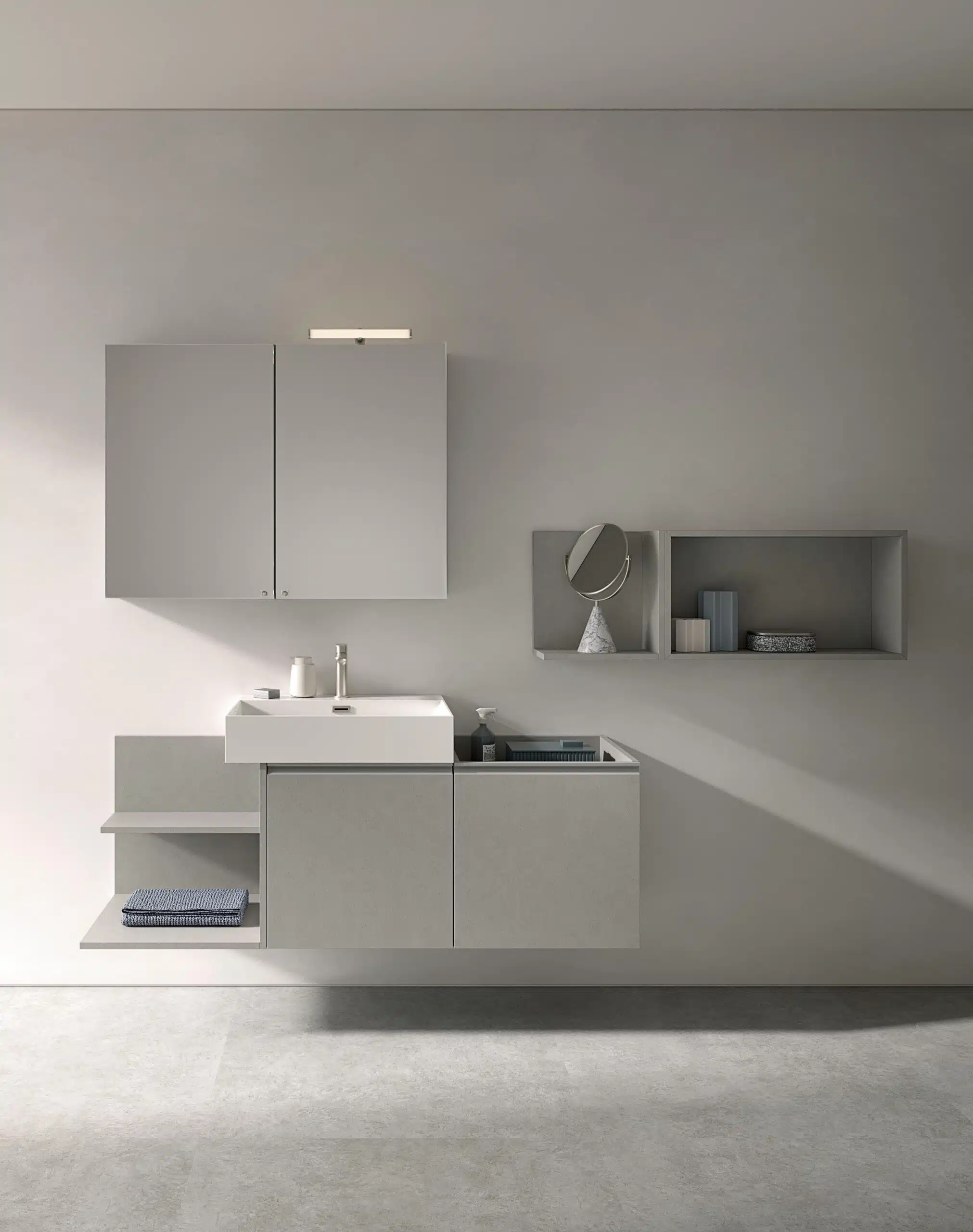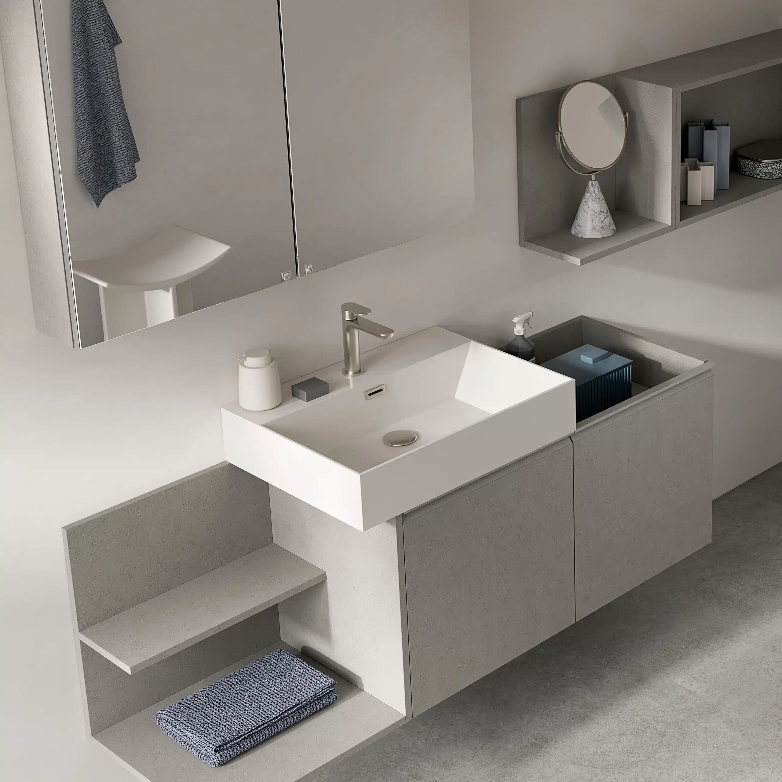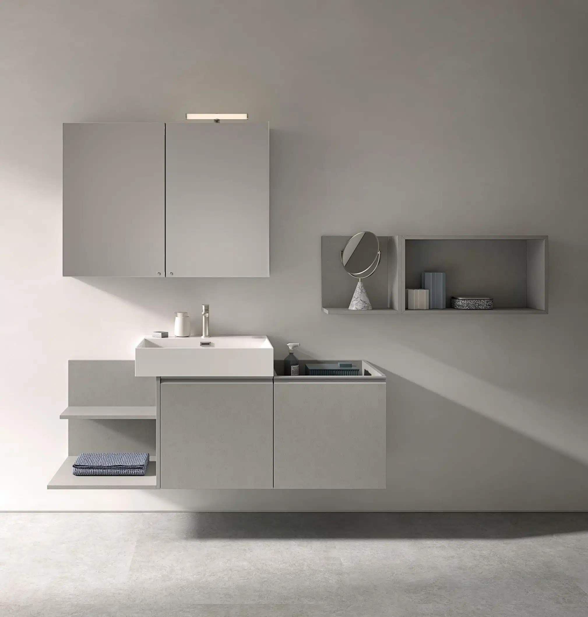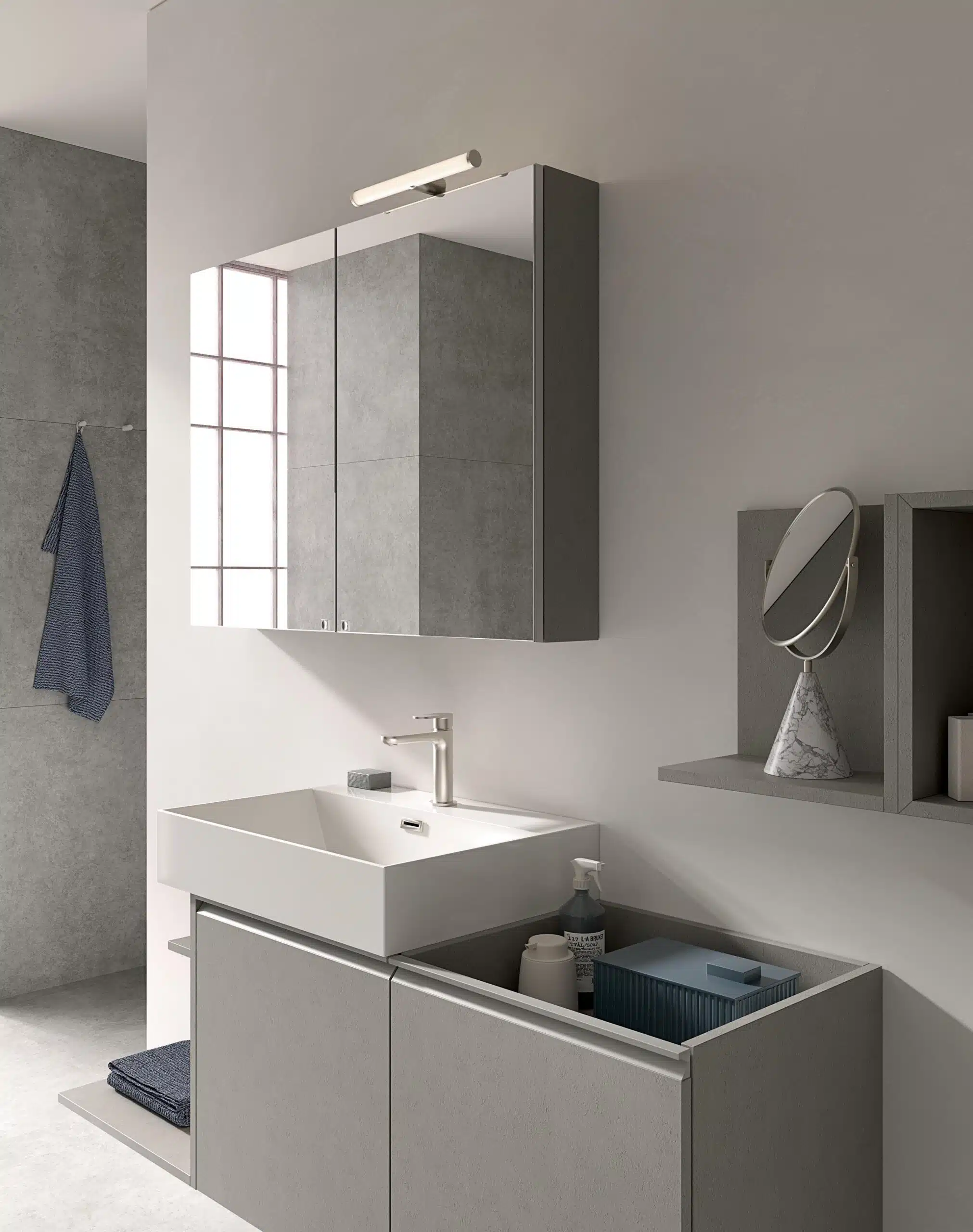 La cura dei dettagli, dalla finitura Storm alle specchiere contenitore, assicura un risultato finale di grande impatto, dimostrando l’impegno di Compab nella creazione di soluzioni d’arredo eccellenti. Affidati alla qualità italiana per un bagno che ti rispecchi.