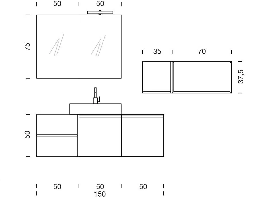 - Dimensioni totali della composizione mostrata: L 150+105 x P 46/20,8 cm