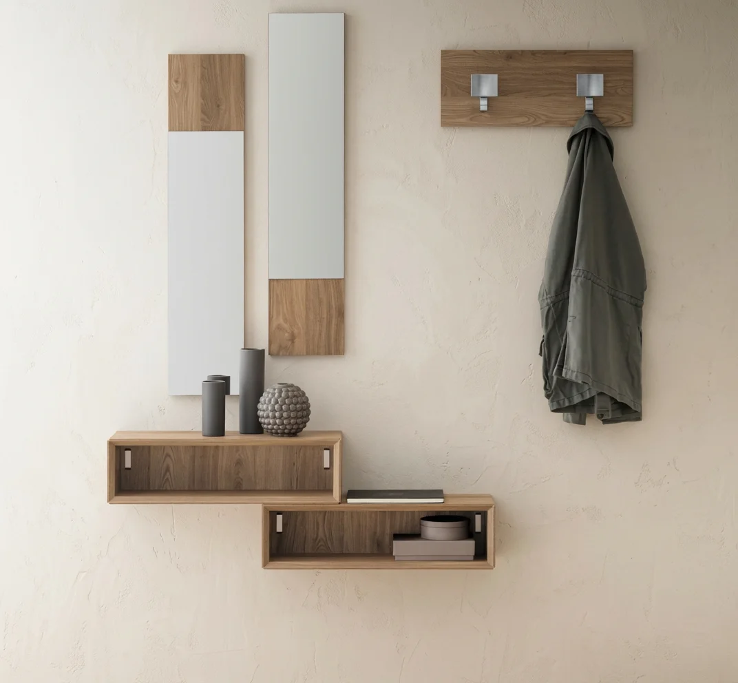 La composizione 616 è un esempio di design intelligente e moderno. I due elementi orizzontali sospesi offrono un comodo piano d’appoggio, ideale per chiavi o piccoli oggetti, mentre le specchiere slanciate donano profondità e luminosità. Il pannello posteriore, su cui è possibile montare gli appendini opzionali, aggiunge un elemento decorativo e funzionale. Il mobile ingresso Lego 616 La Primavera è la scelta ideale per chi desidera un arredo personalizzabile e dal carattere deciso.