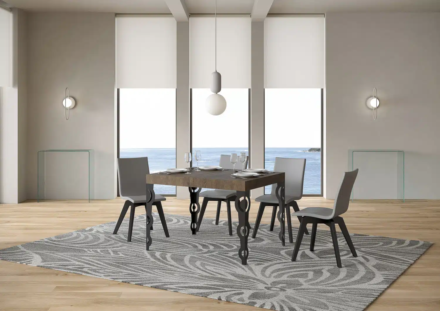 Tavolo allungabile Karamay da 120 cm, dal design moderno dallo stile ricercato e stravagante, si adatta a qualsiasi stile di arredamento e si rivela la scelta ideale sia come tavolo da pranzo che come elemento d’arredo per il soggiorno, dove poter accogliere i propri ospiti con stile.
